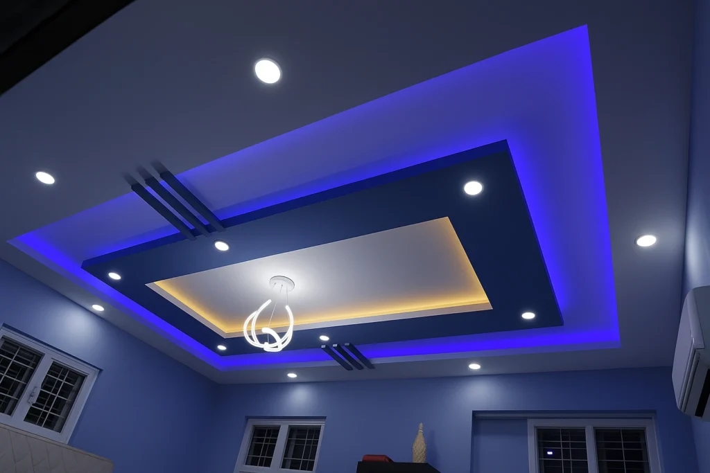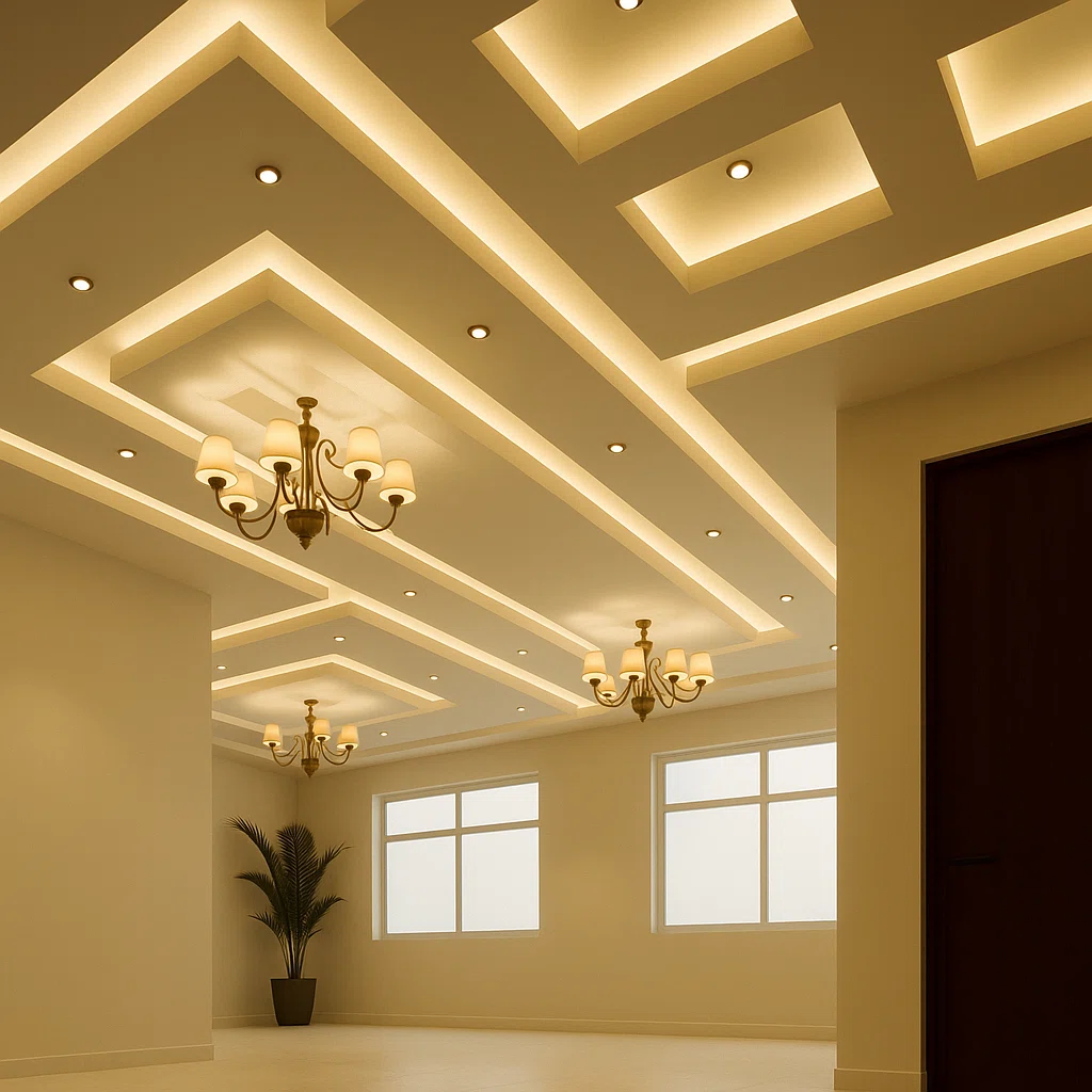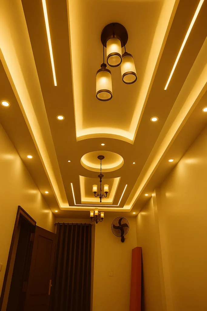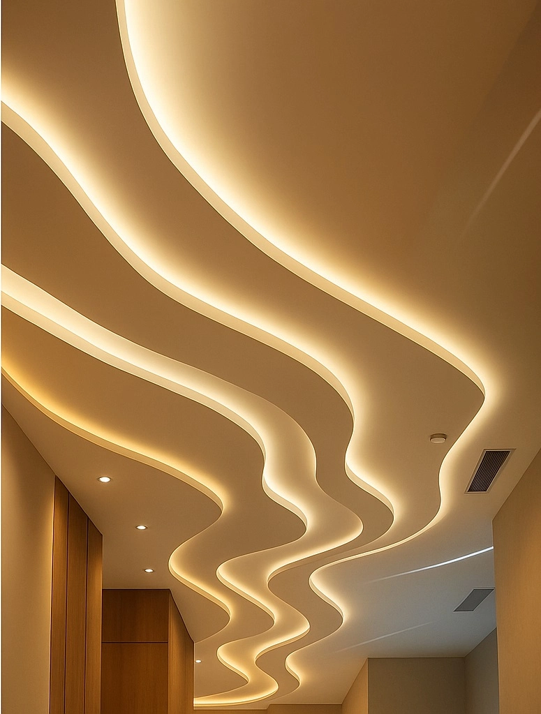 كما يمكن دمج الإضاءة المخفية داخل التصميم لإبراز جمال السقف وإضافة أجواء مريحة وفاخرة.