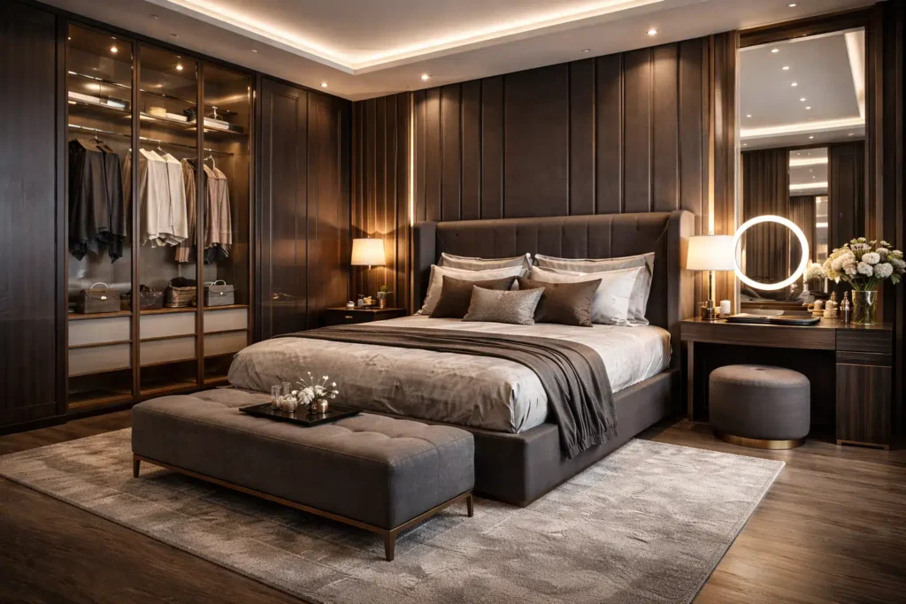 - الخزائن المدمجة: تصميم دواليب واسعة مع تقسيمات داخلية مخصصة للساعات، المجوهرات، والملابس الطويلة.